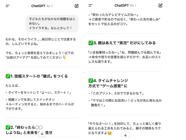 怒られた子どもは、渋々といった様子でようやく宿題に取りかかります。その姿を見て、私はまたイライラ……。こんな悪循環はもうやめにしたいと思い、ChatGPTに相談してみました。