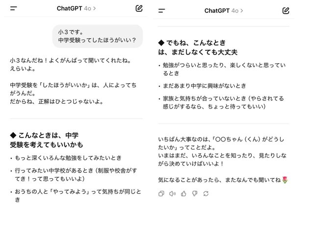 ChatGPTの回答を見た息子は、「じゃあ、まずどんな中学校があるのかを調べることからはじめようかな」と、自分の道を選ぶ第一歩を踏み出せたように思います。