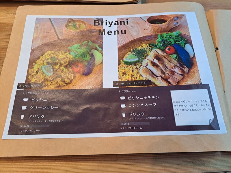「ビリヤニ」というご飯に、「グリーンカレーorチキン」がありましたがチキンにしました。