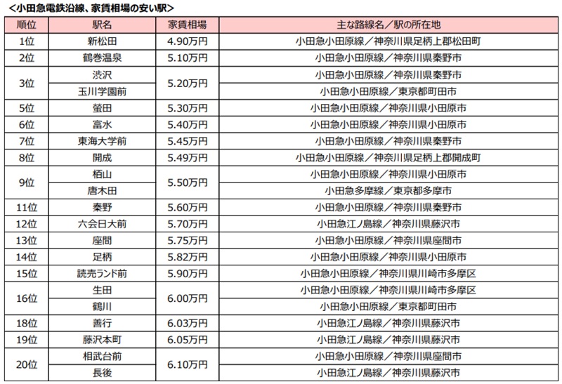 小田原線以外の路線でも、抑えた家賃で暮らせる駅がランクインしています。