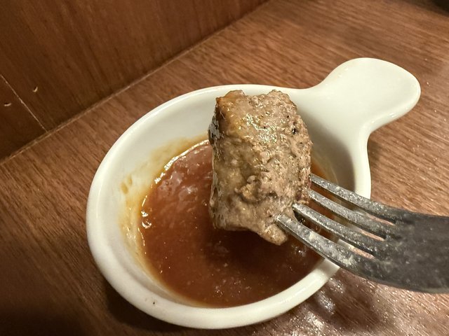 今回はオニオンソースをチョイス。玉ねぎの甘みが効いたまろやかなソースで、肉の旨みを一層引き立ててくれます。