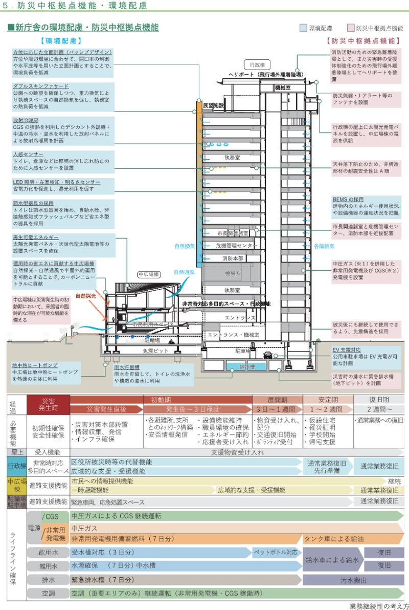 素案では免震構造を採用し、最大7日分の備蓄と、災害時の受援体制を支えるヘリポート等の整備を検討。停電時の自立性を高める非常用電源、通信の多重化、市民向け情報発信機能の強化など、広域災害を想定したBCP(事業継続計画)を計画に織り込むとしています。また、災害時の連携に配慮して、7階の危機管理センターに近接した8階に視聴関連の諸室が配置される計画です。