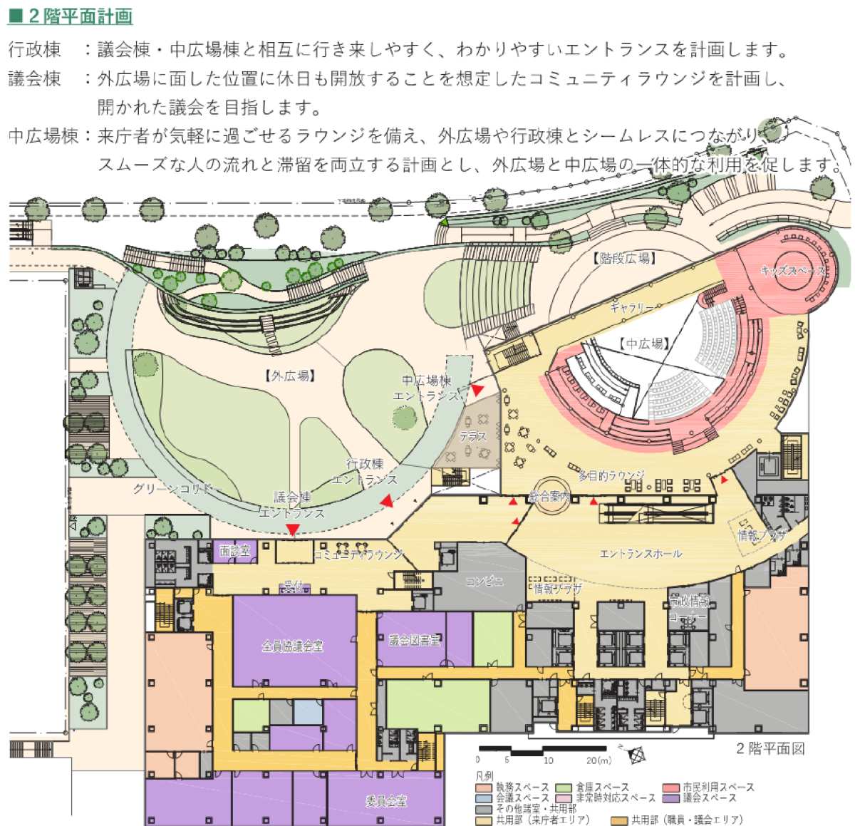 議会棟や中広場棟を含む複合構成により、市民活動や情報発信の場としての利活用も想定しているということです。