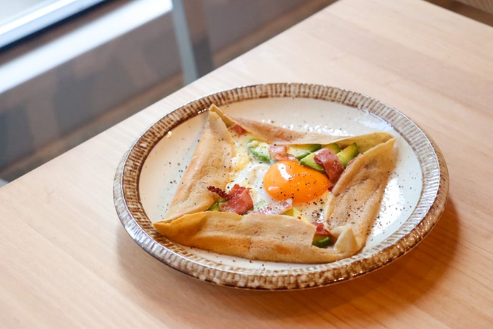 森のバターとも呼ばれるアボカドを主役に、卵やベーコンの具材を薄く焼いた生地にたっぷり乗っけた逸品!