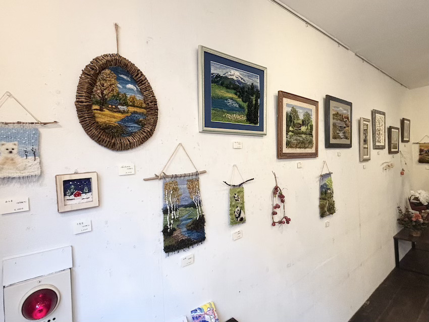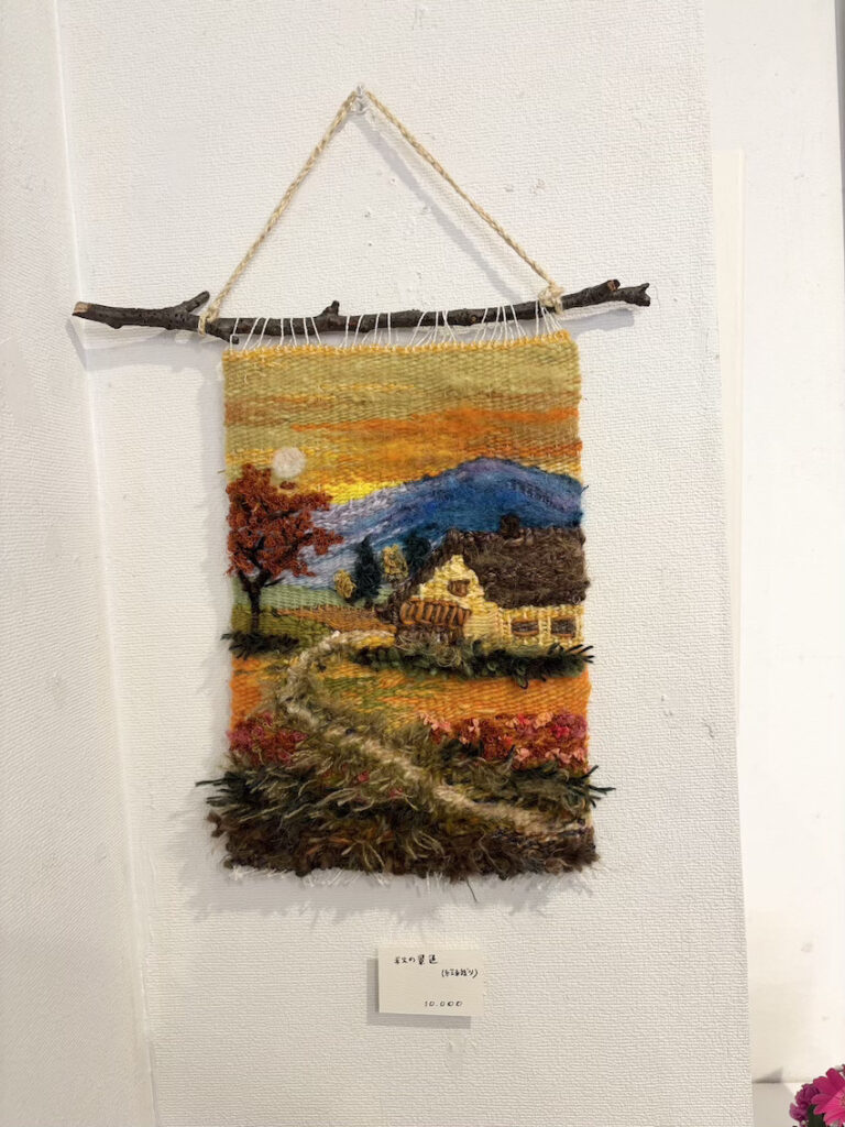 展示されているのは、押し花の作品と、イギリス発祥の「ボードウィービング」という技法による“絵織”の作品。