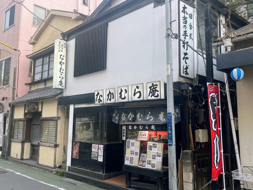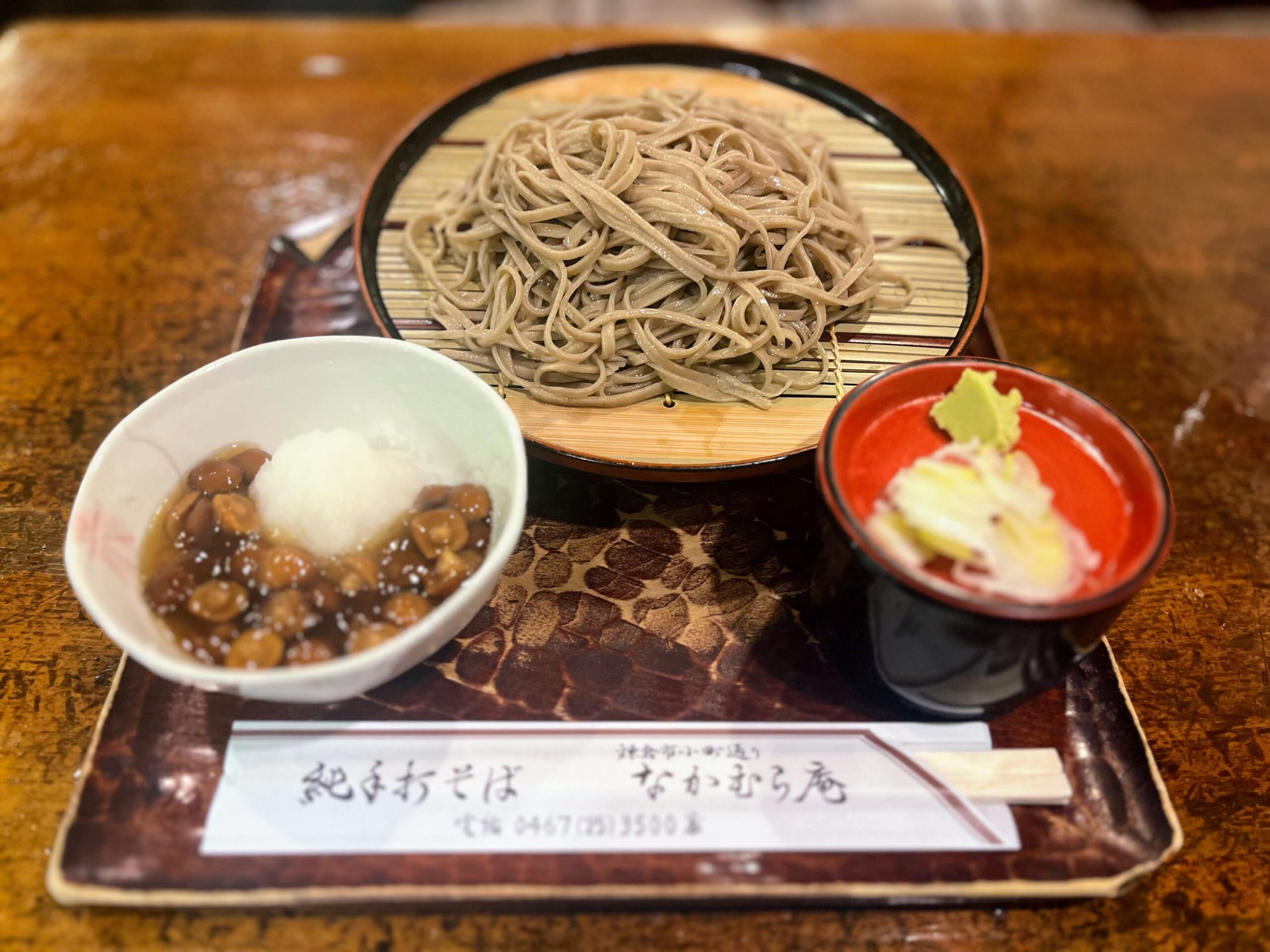 鎌倉駅東口を出てすぐ、小町通りすぐにある「なかむら庵」は、午前中にはガラス張りのそば打ち台から職人さんがそばを打つ様子を見られる老舗のお蕎麦屋さんです。