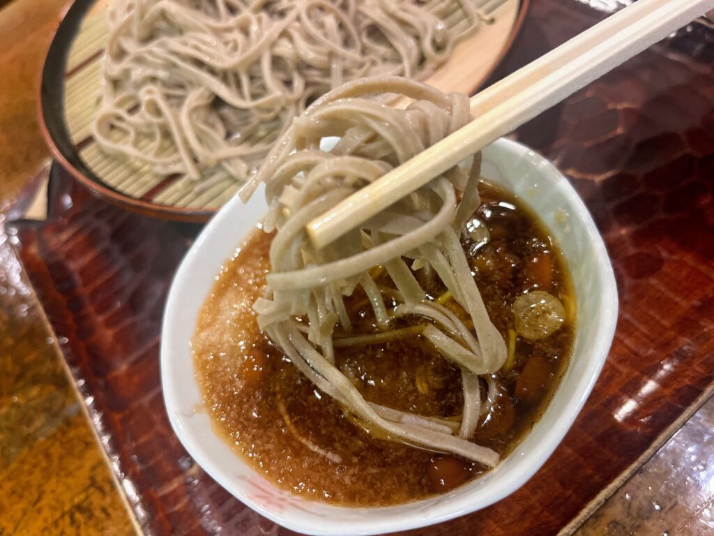 おすすめ通り、そばつゆをなめこおろしの器に注ぎ、豪快にいただきます。少し辛みのあるおろしと、トロッとしたなめこに、コシのあるお蕎麦が絡み、おそば本来の風味を引き立てます。喉ごしもよく、あっという間に完食しました。