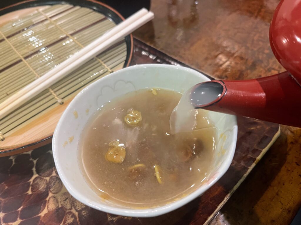 食後のお楽しみは、そば湯です。老化防止効果が期待できるそばポリフェノールや、良質なタンパク質・ビタミン・ミネラルが溶け込んだ、お店自慢のそば湯はトロッと濃厚。残ったおつゆにしっかり絡めて、最後まで味わい尽くしました。