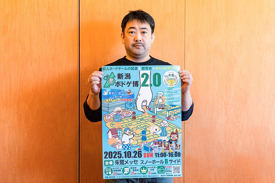 皆さんは「ボードゲーム」といえば何を思い浮かべますか? トランプや将棋、すごろくなどもボードゲームのひとつ。今月の26日、同人ボードゲームのイベント「新潟ボドゲ博」が朱鷺メッセで開催されます。主催者の米田さんに、自身がボードゲームをつくりはじめたきっかけや、イベントのことなど、いろいろお話を聞いてきました。
