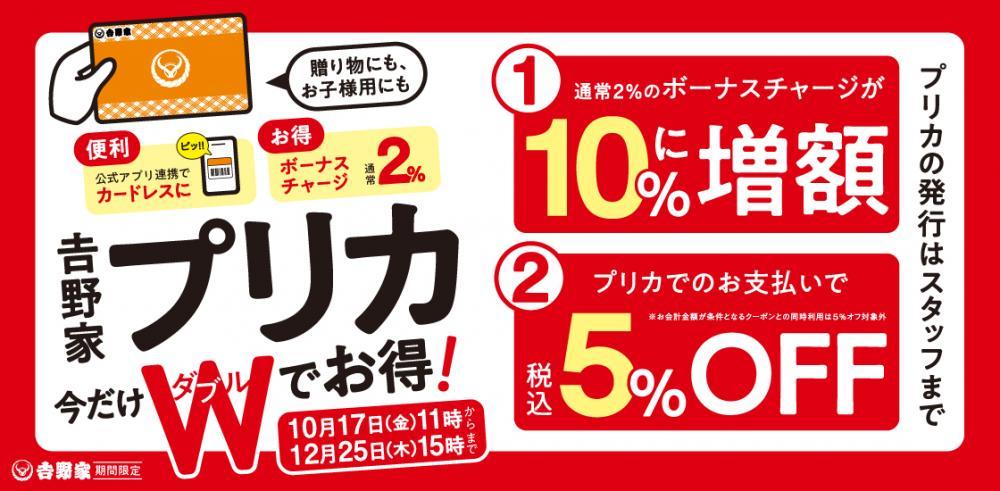 通常はチャージ金額に対して2%分のボーナスチャージが付与されますが、キャンペーン期間中は2%から10%に増額。さらに、「吉野家プリカ」で支払うと、会計金額から5%オフになります。店内飲食とテイクアウトの両方が対象です。