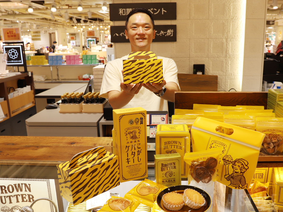 「こがしバターケーキ」初のブランドショップとなる「Mukashin」では、「こがしバターケーキ」(4個入=641円、5個入=801円、6個入=961円、8個入=1,281円、12個入=1,921円、18個入=2,881円)や、「こがしバターサブレ」(12枚入=1,261円、24枚入=2,471円、36枚入=3,581円)、同店限定のトラ柄パッケージに入った「こがしバター・サブレ詰め合わせ」(こがしバターケーキ3個、こがしバターサブレ3枚、801円)などを販売する。