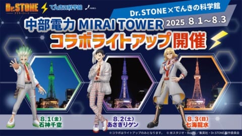 イベント限定のオリジナルグッズを販売するポップアップストアが開設され、石神千空やあさぎりゲンらの描き下ろしビジュアルを使用したアイテムが提供されました。また、名古屋の象徴である「中部電力 MIRAI TOWER」では、TVアニメ「Dr.STONE」のキャラクターカラー仕様のライトアップと特別映像の放映が行われ、夜の街を鮮やかに彩りました。