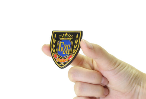 出演者が衣装の左胸に着けている校章(エンブレム風ワッペン)が、重厚感のあるダイキャスト製のピンバッジになりました。高さ約42mmのボリュームある商品です。