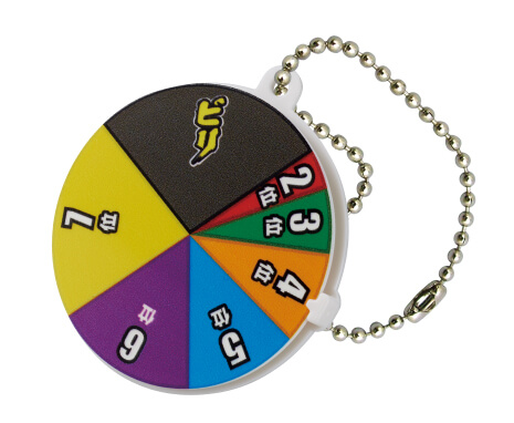 番組内で「誰がおみや(おみやげ)代を支払うか」を選ぶダーツを、実際に回して遊べるミニチュアキーホルダーにしました。ボールチェーンが付属します。