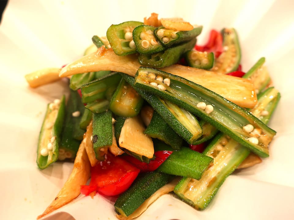 オクラとマコモダケの 醤油風味干鍋炒め(四川料理)