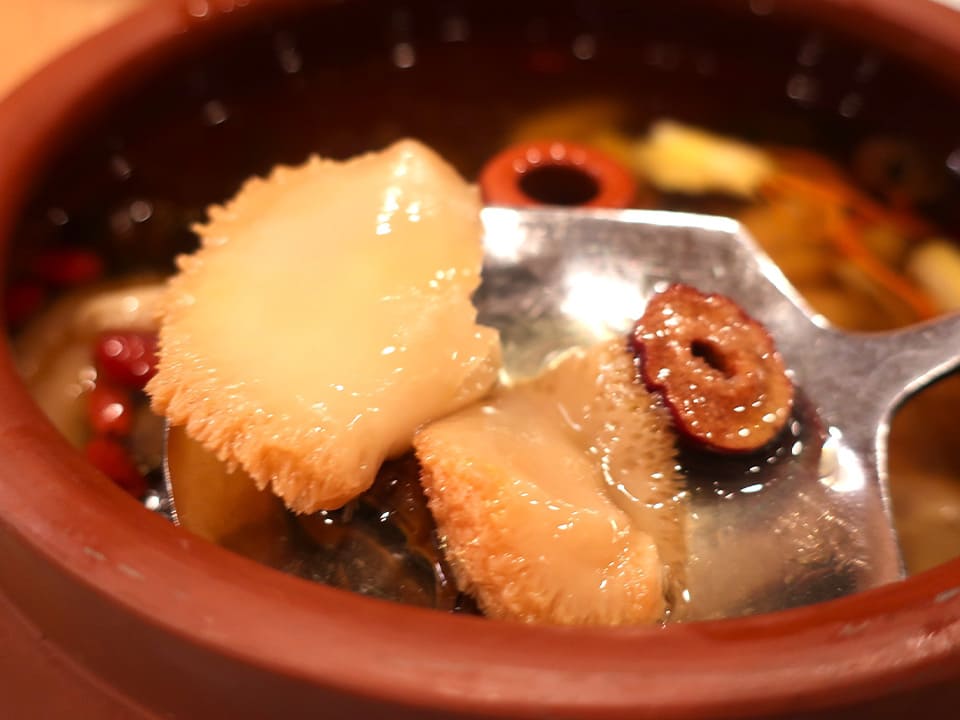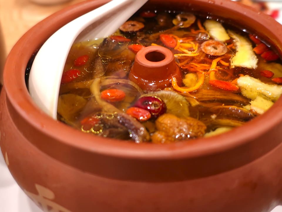 激辛料理の中において、オアシスの泉となったスープ。香り豊かな蒸気スープは、5時間かけて鶏肉、生姜、クコの実や棗などのさまざまな漢方食材から栄養を抽出させた、とても贅沢な薬膳スープです。