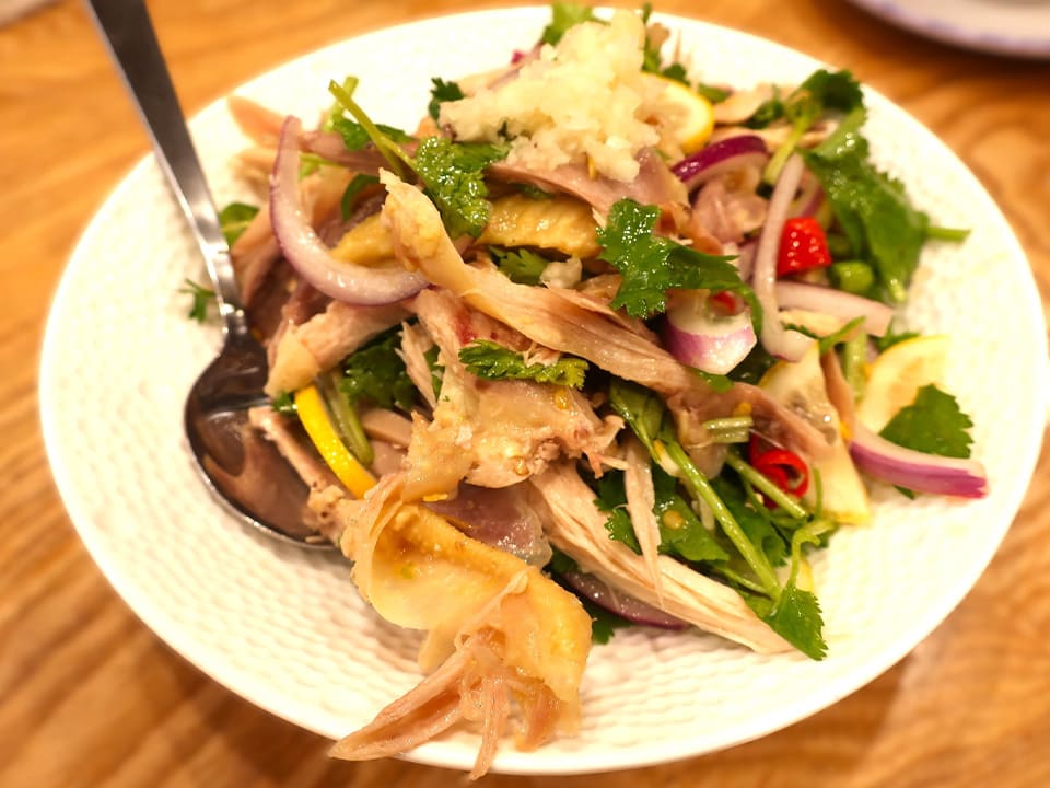 次は、ほぐした鶏肉、そして香菜、赤たまねぎ、レモン、唐辛子で和えたサラダ感覚の一品。ピリッときますが、さわやかな辛さと酸味で、食欲が増してきます。雲南料理ながら、魚醤を使うベトナムやタイの料理も連想させました。