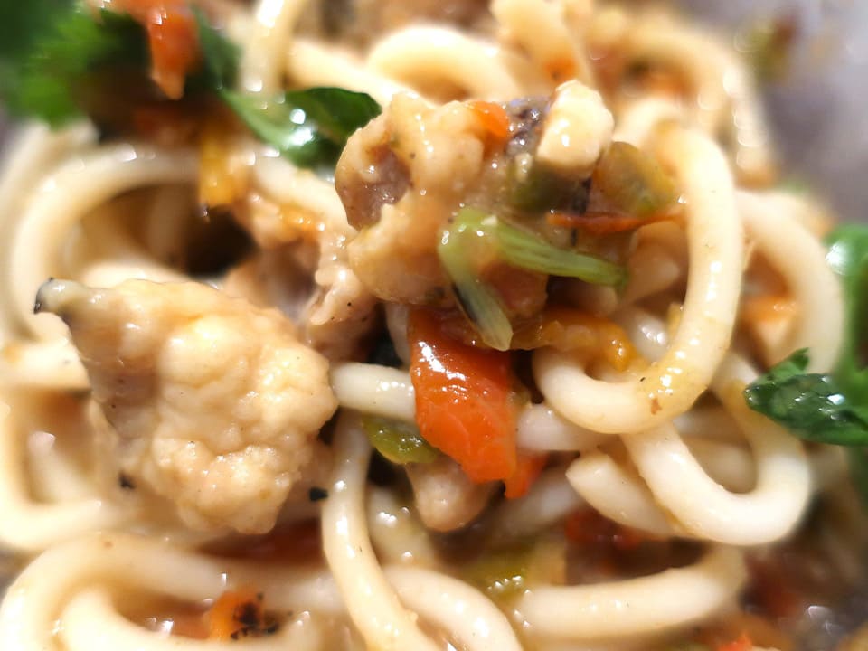 焼き唐辛子と焼きトマトと焼き豚のミックス混ぜライスヌードル