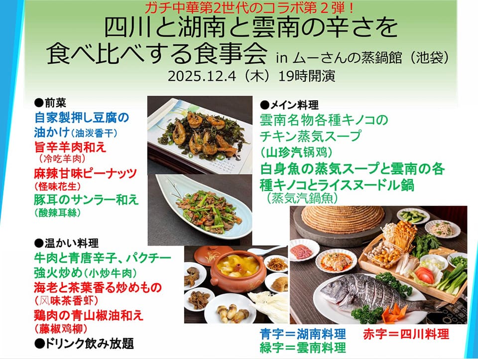 日時2025.12.4(木)19時より会費7000円場所ムーさんの蒸鍋館(豊島区西池袋1-28-1 第二西池ビル6F)