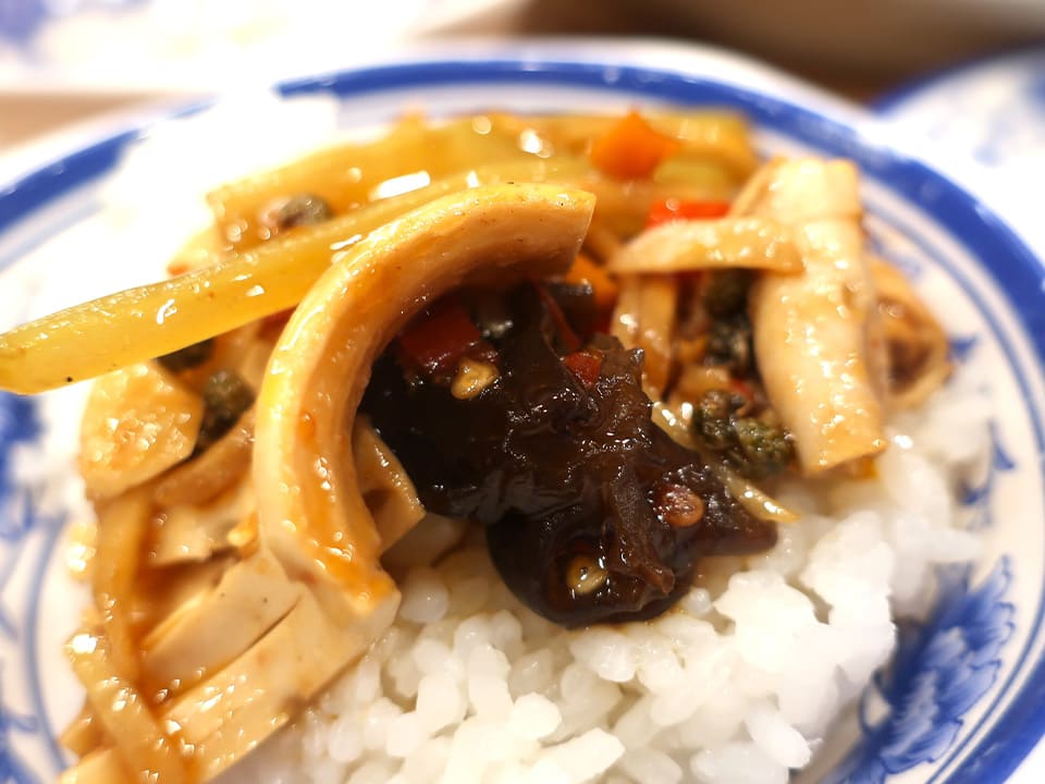 怒涛の辛い料理の数々、次は赤唐辛子が攻めてきます。四川の辛さに酔いしれながら、コリコリ食感の牛ハツモトと木耳、シャキシャキのセロリ、交互にくる食感を楽しみます。辛いけれど後をひく醤油ベースの味付けには、ごはんをコール!