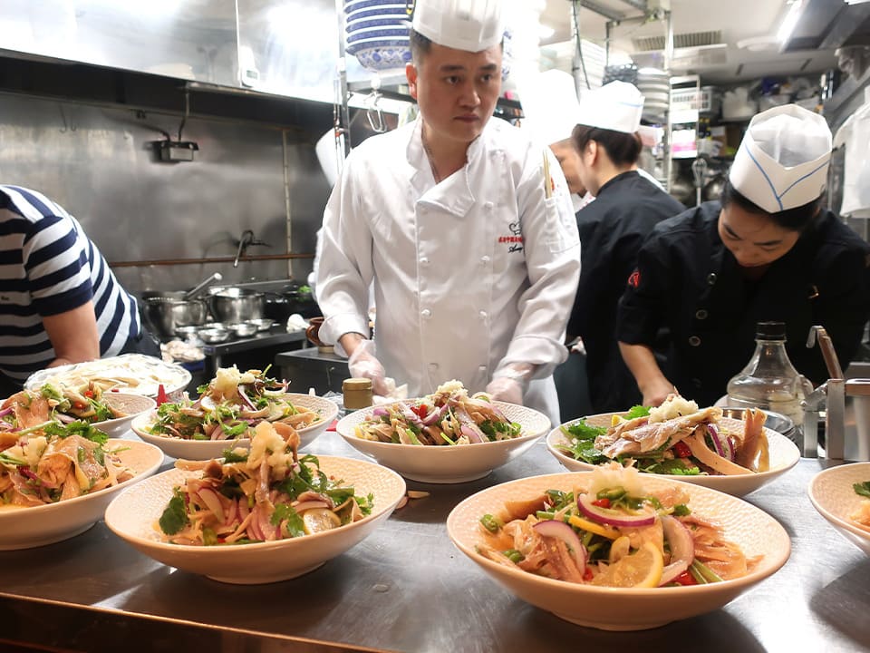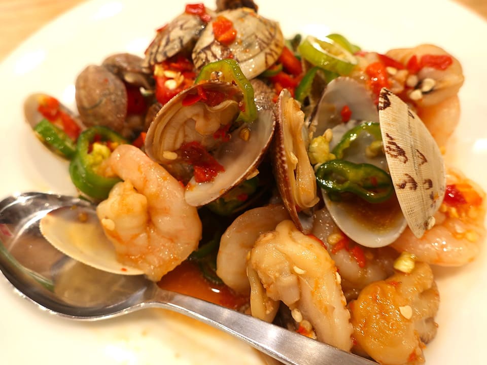 まずは、プリプリの海鮮。いきなり、青唐辛子と赤唐辛子のダブル唐辛子で洗礼を受けます。口に入れた瞬間、あちこちの席で「おおお~!」「辛い~!」と、どよめきが起きました。しょっぱなからこの辛さ、どうなってしまうのでしょうか?!