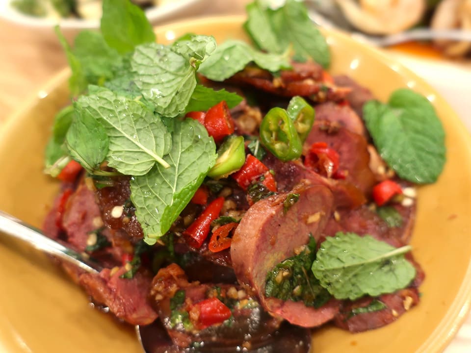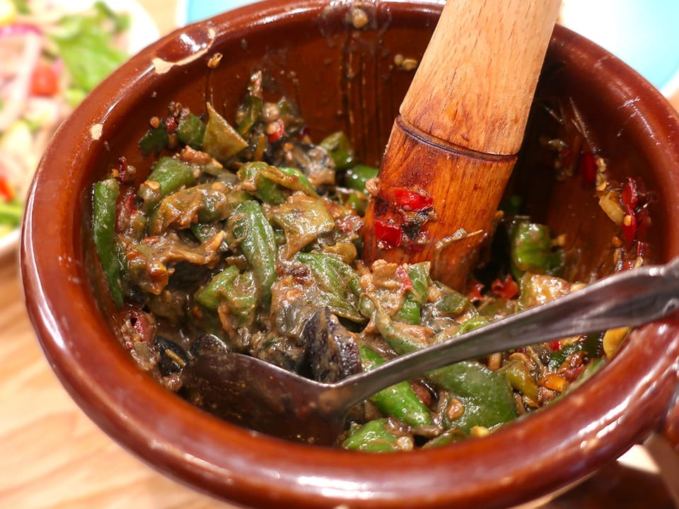 参加した方々数名にも感想を聞いてみたところ、皆さん同様の答えでした。すり鉢のような器に素材を入れ、木の棒で叩いていく様子は、タイ料理のソムタムなどを作る感じと似ています。ピータンと青唐辛子なので、ピータンの味を想像しながら口へ運ぶも、口に入れた瞬間、火が出そうなくらいの辛さがやってきました。