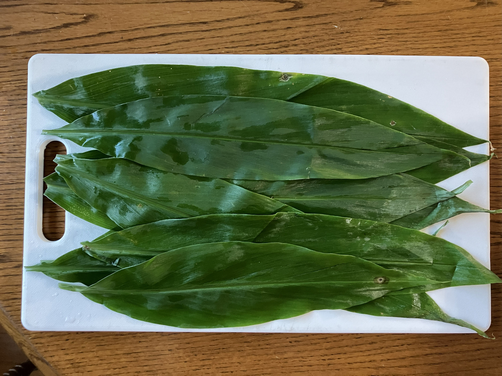 谷内伝承工房館で見せていただいた「みょうが葉焼き」のレシピには、小麦粉、砂糖、塩、水、とありましたが、御裾分けでいただいた物には紅ショウガも入っていて、味のアクセントになっていました。作ってみたくて色々と伺っていたら、残ったみょうがの葉をくださいました。