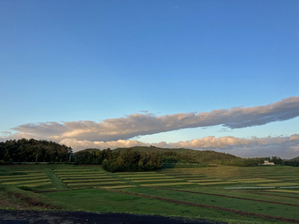 東和温泉に向かう途中の風景。あまりに綺麗だったので、車を止めて撮影しました。朝日の赤みある光と深みのある黄色い稲穂のコントラストが絵葉書になりそう。