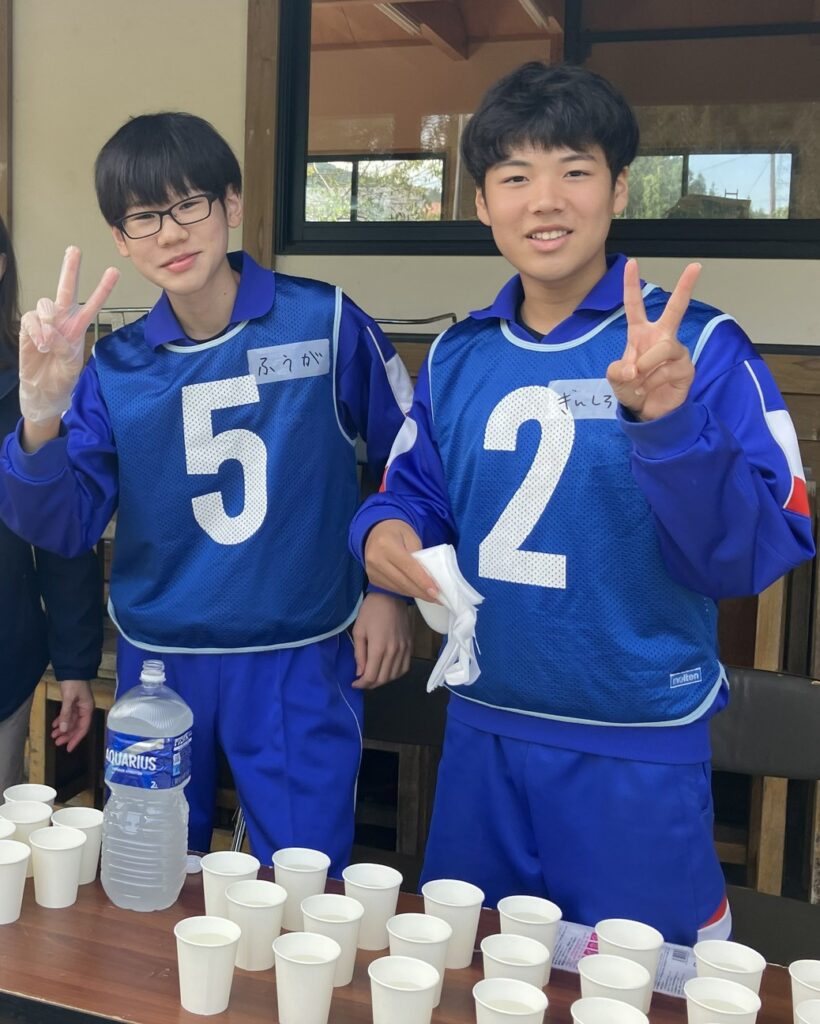 一緒にエイドを担当した中学生ボランティアのふうが君とぎんしろう君は、テーブルを整えたり走ってくるランナーが水や「こびり」を食べやすいよう、テキパキと準備を進めています。
