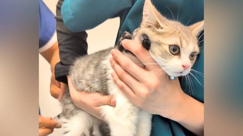 寝ているはっちゃんの横で、何か言いたそうに視線を送ったり、匂いをかいだりするじゅんちゃん。じゅんちゃんがふと顔を上げると、顎の下には『見知らぬ子猫の人形』が…!