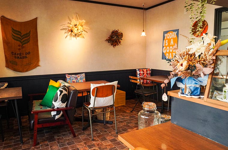 店主のこだわりがあちこちに散りばめられた店内は、アメリカンとアンティークが心地よく混ざり合う空間。2人掛けのテーブル席や、気軽に座れるカウンター席があり、ランチからカフェタイムまで、友人同士やママ友たちがゆったり会話を楽しむ和やかな光景が広がっています。