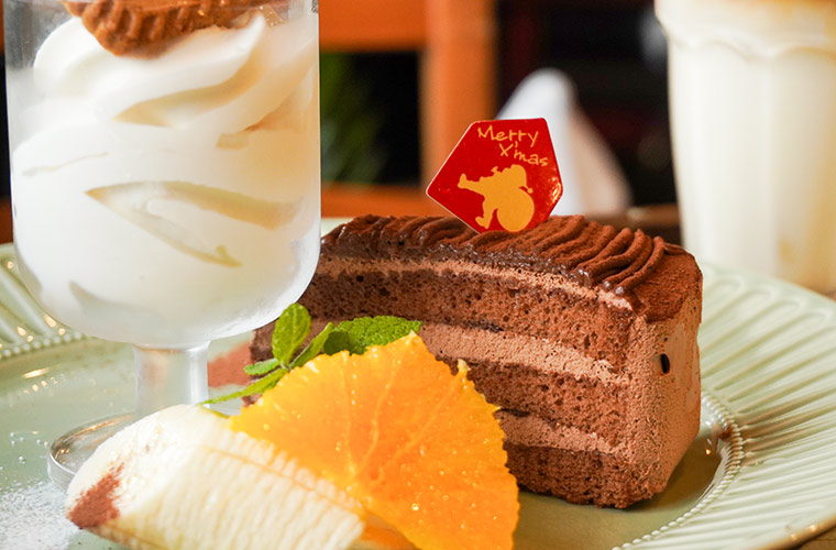 この日のケーキは、しっとりとしたココアスポンジに、なめらかなチョコクリームを交互に重ねた「チョコレートケーキ」。甘さを控えた上品な味わいと軽い食感が魅力の一品です。そこに、ミルキーでスッキリとした甘さのソフトクリームを添えると、一層コクが増して贅沢な味わいに。プレートで提供される同店のスイーツだからこそ楽しめる、うれしい“味変”もぜひ楽しんで♪