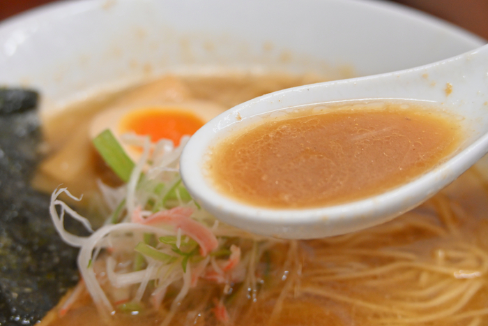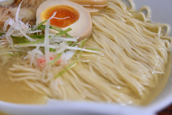 キリっとした塩ベースのスープに鶏油の旨味と甘みを感じる奥深い旨さ!バターが入っているのでコクもしっかりと感じます。そしてジューシーな炙りチャーシューが加わって香ばしさも楽しめる一杯。