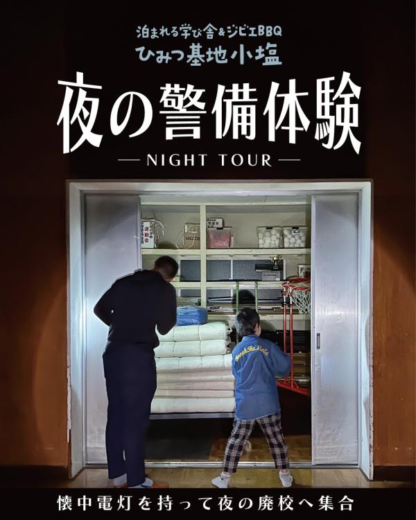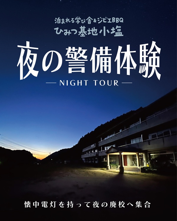 福岡県うきは市の山間部に、廃校となった旧小塩小学校を改装した宿泊施設「泊まれる学び舎&ジビエBBQ ひみつ基地小塩(こじお)」が今秋オープン!その記念に、ちょっとドキドキする特別なイベントが11月30日(日)に開催されます。その名も『夜の警備体験』!