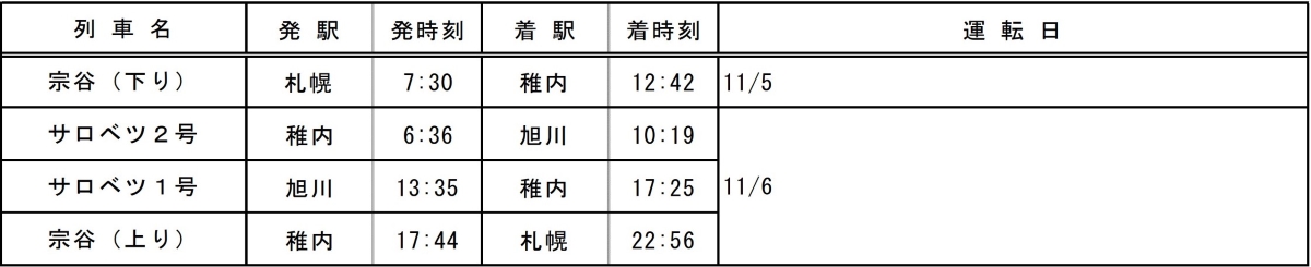 11月6日は、稚内6時36分発→旭川10時19分着の特急「サロベツ2号」、旭川13時35分発→稚内17時25分着の特急「サロベツ1号」、稚内17時44分発→札幌22時56分着の特急「宗谷」(上り)を「ラベンダー」編成で運行する予定です。