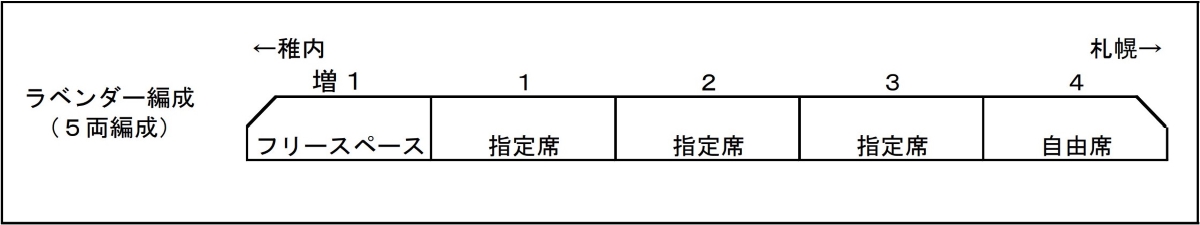 運行される編成は、稚内側にフリースペースの増1号車、続いて1号車~3号車が指定席、札幌側の4号車が自由席となっています。なお、この編成にグリーン車はありません。