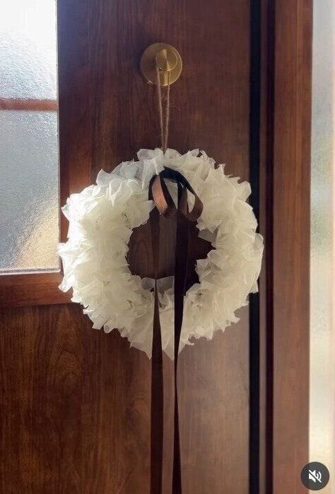 ayumiさんは、こちらのリースを。材料はすべてセリアでそろえたんだそう。切ったクッキングシートをお花のように仕上げ、購入したリースにまんべんなく貼り、ベロアリボンをポイントにしたら完成♪ リボンを長めにたらすのも素敵!シンプルで美しいリースですよね。