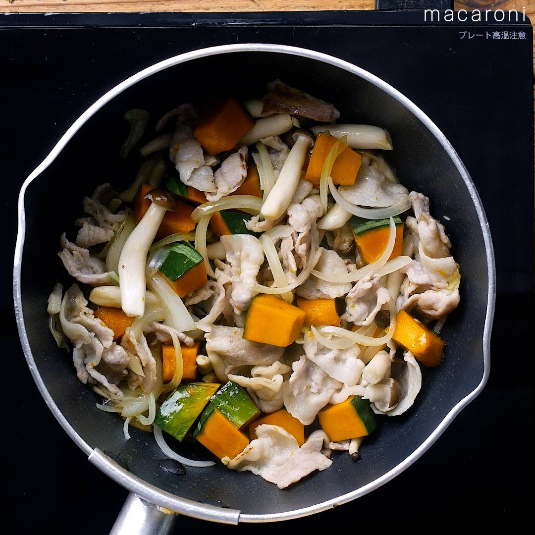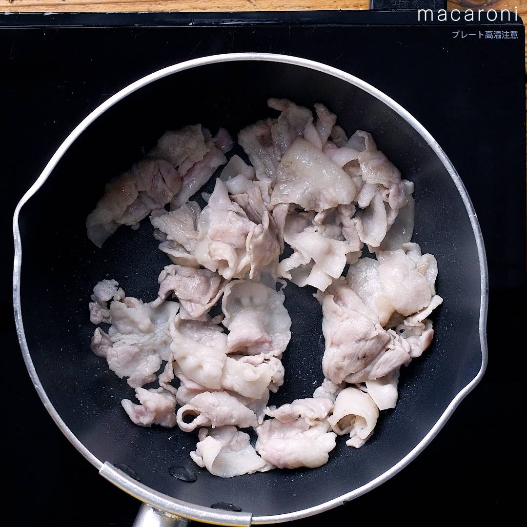 1: 鍋に豚肉を広げて色が変わるまで炒めます。