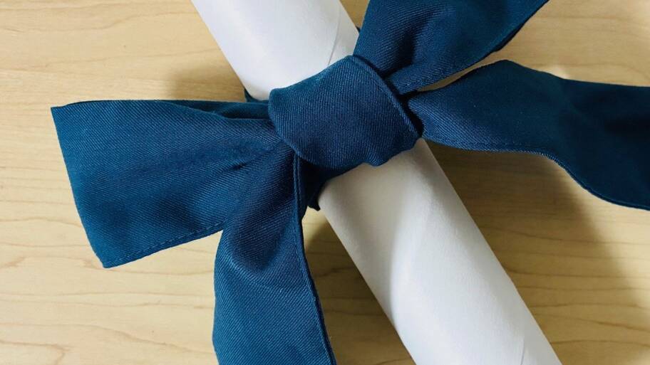 【5】短い布の端を上からかぶせ、リボン型になった布の下に押し込み固定したら完成!