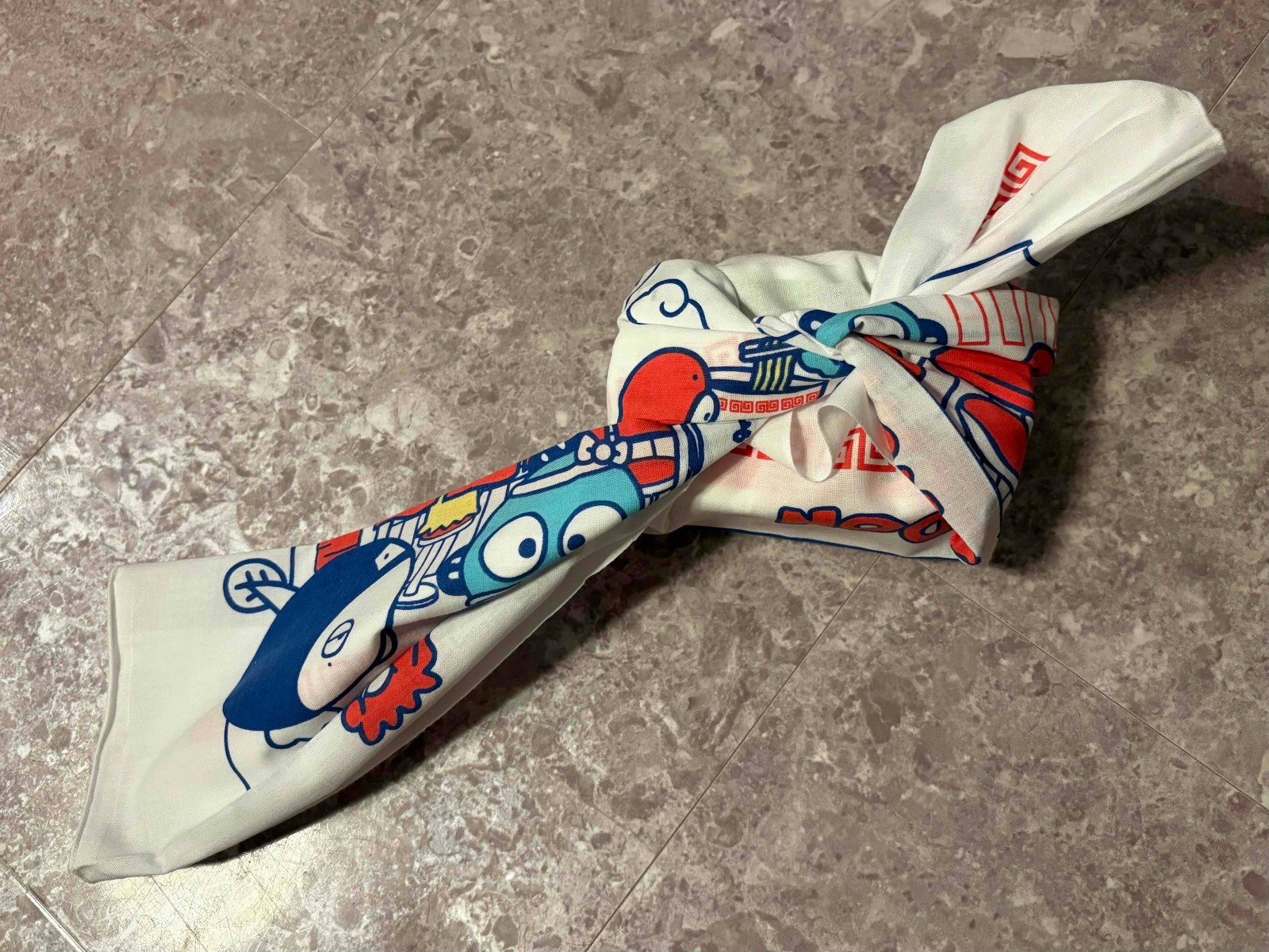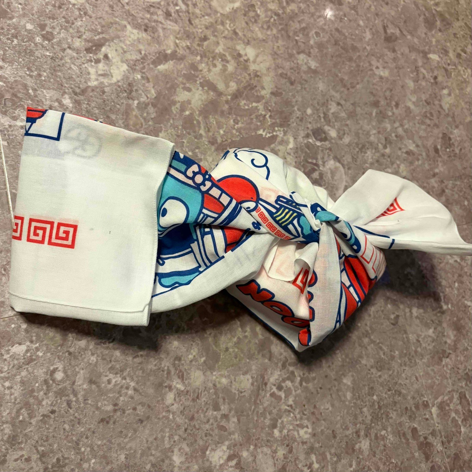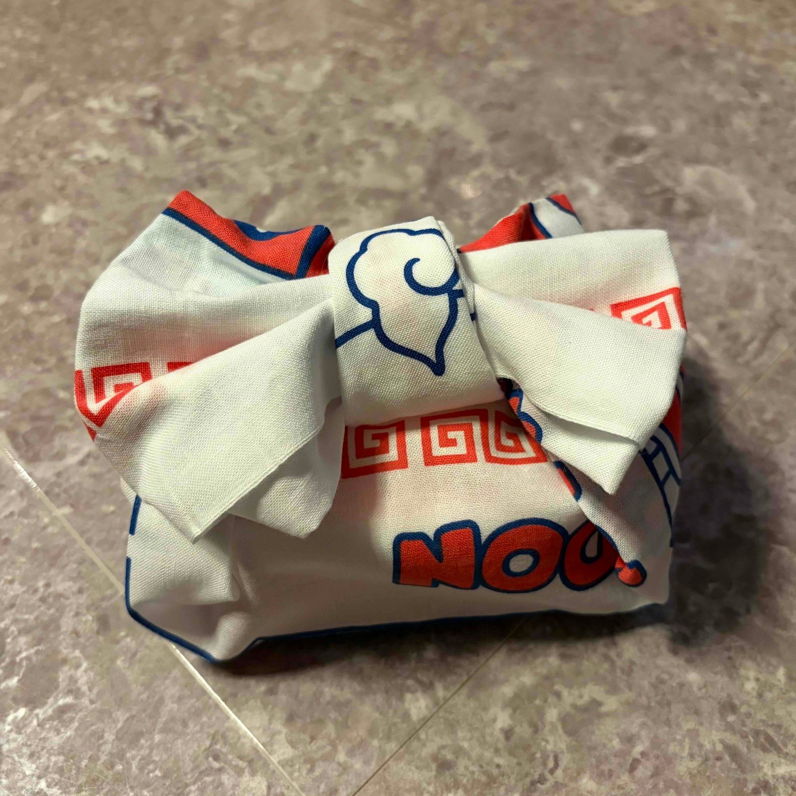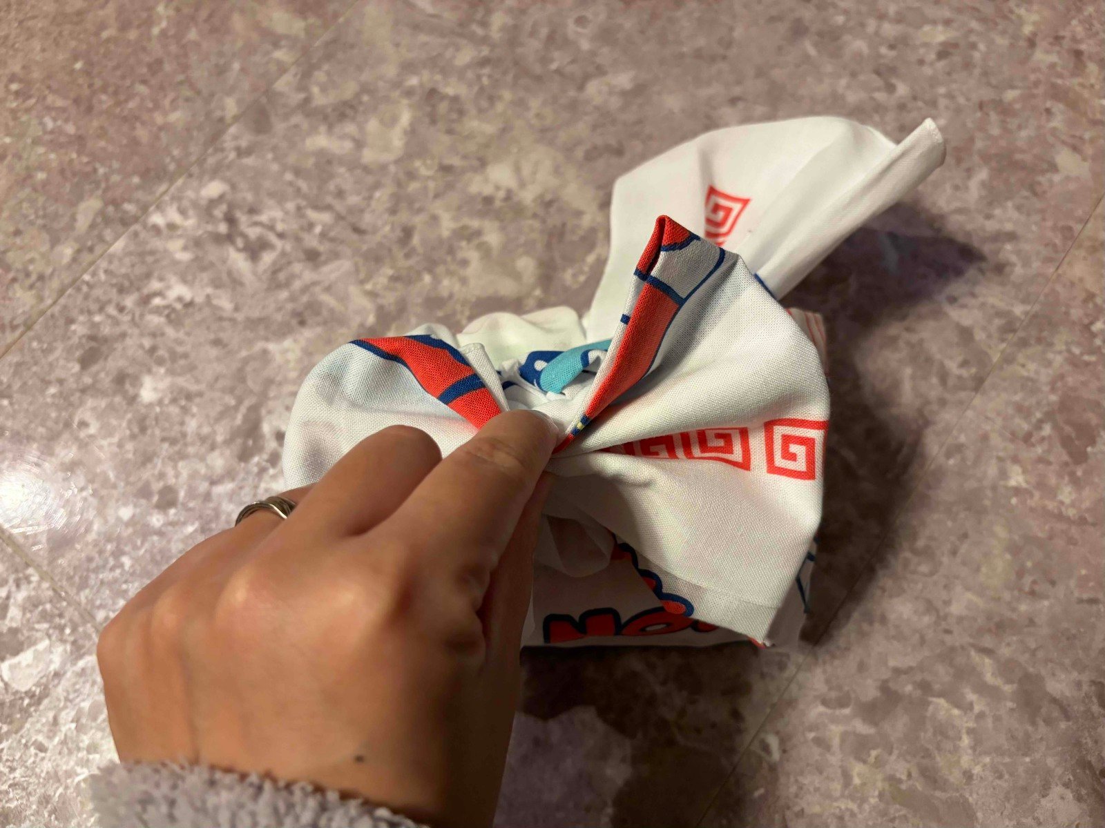 かわいいリボン結びのお弁当包みが、手ぬぐいで簡単にできました! こういった包み方を知っていると、普段のお弁当がより華やかになりますね。