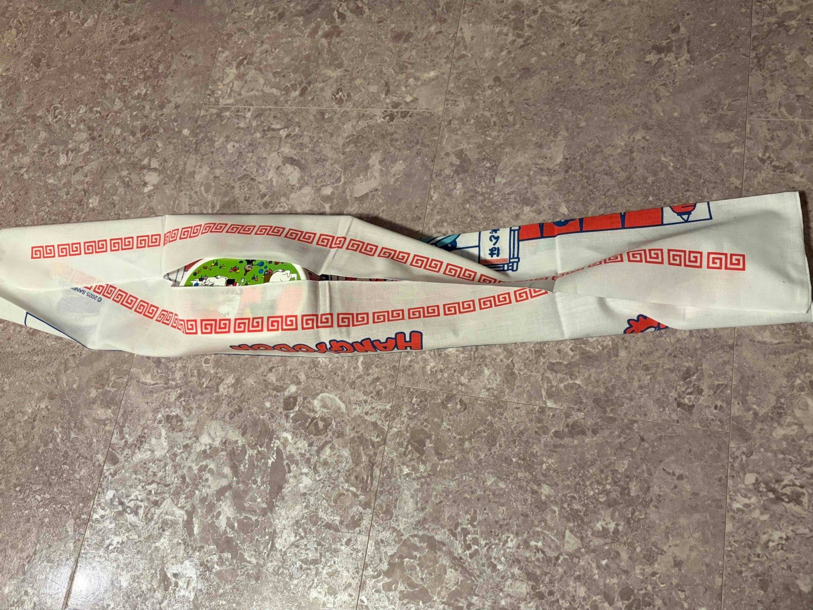 まず手ぬぐいを広げ、真ん中より左側に弁当箱を置きます。写真のように、弁当箱の上方向、下方向のそれぞれから手ぬぐいをかぶせ、包み込みます。