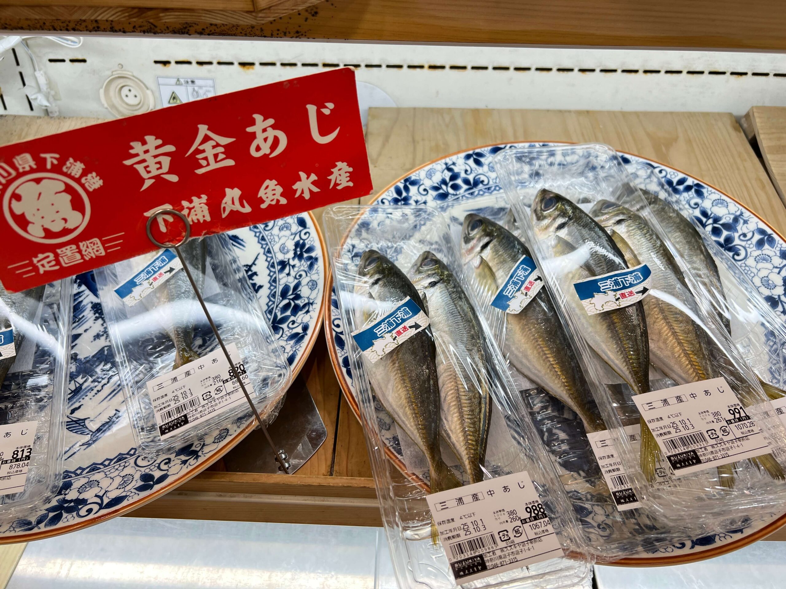 この日は逗子の小坪漁港直産のかさごと、人気の三浦市下浦の小あじと「黄金あじ」が並んでいました。