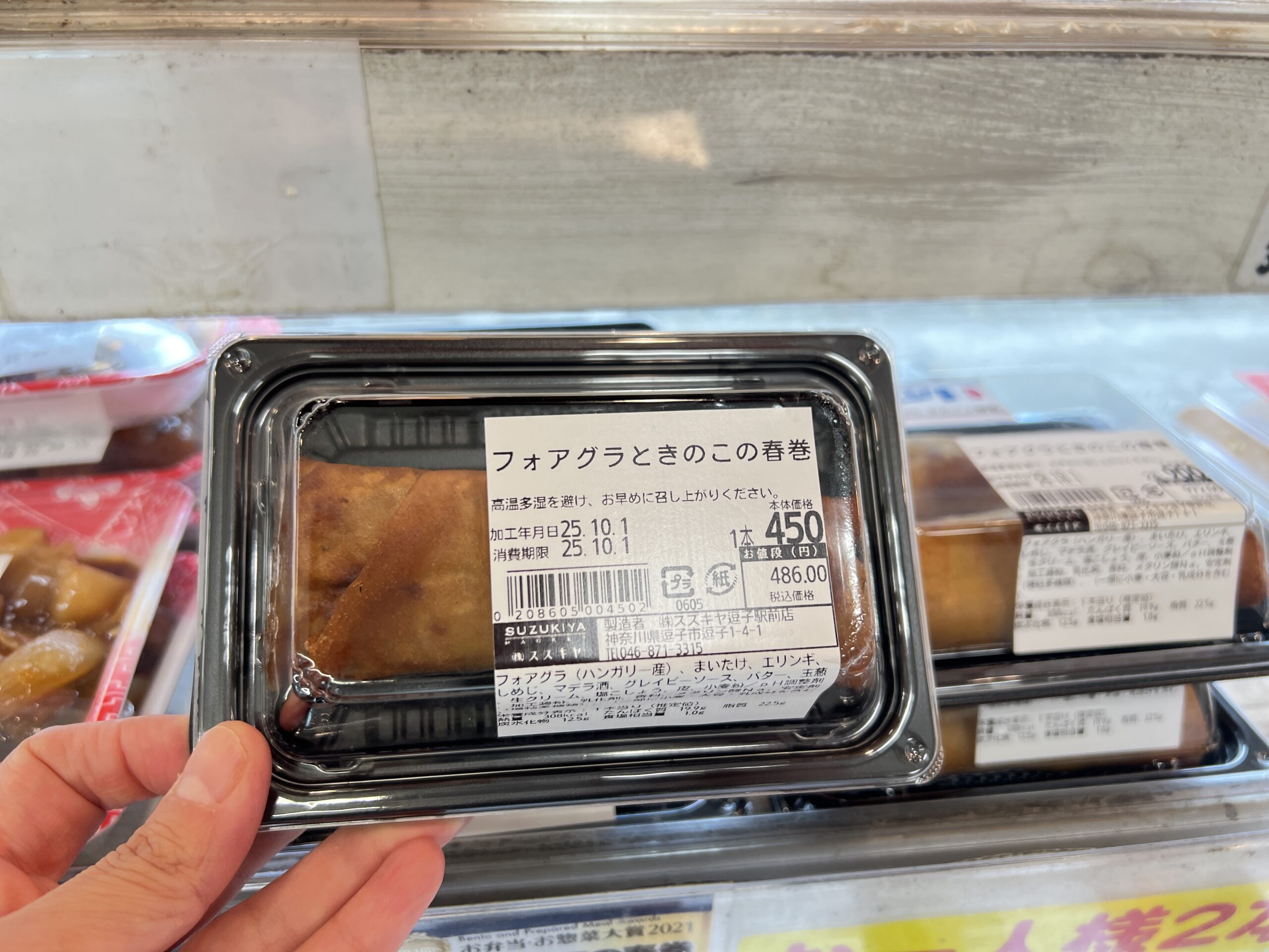 「スーパーにこんなものが!?」と驚くお客さんが多いのが、「お弁当・お惣菜大賞2021」の中華点心部門で優秀賞を受賞したフォアグラときのこの春巻きです。逗子の人気料理店、無国籍料理店「食彩堂」のメニューを商品化したものだそう。