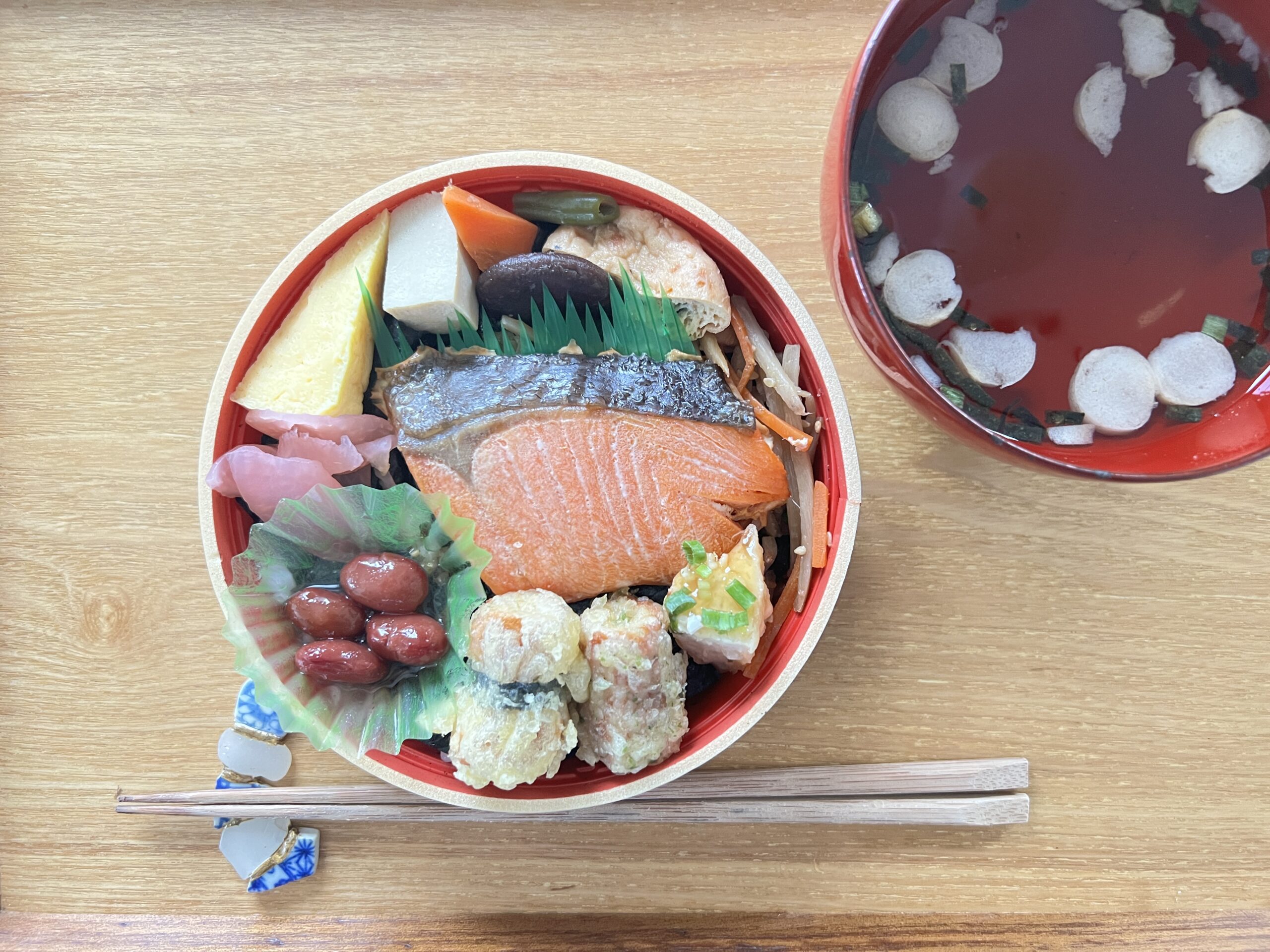 鮭の切り身は、大ぶりでしっとりとしていて、この一切れだけでも満足感があります。のりの下には、香り高い鰹節と塩昆布が敷き詰めてあり、ご飯自体にもほんのり昆布の出汁が効いています。