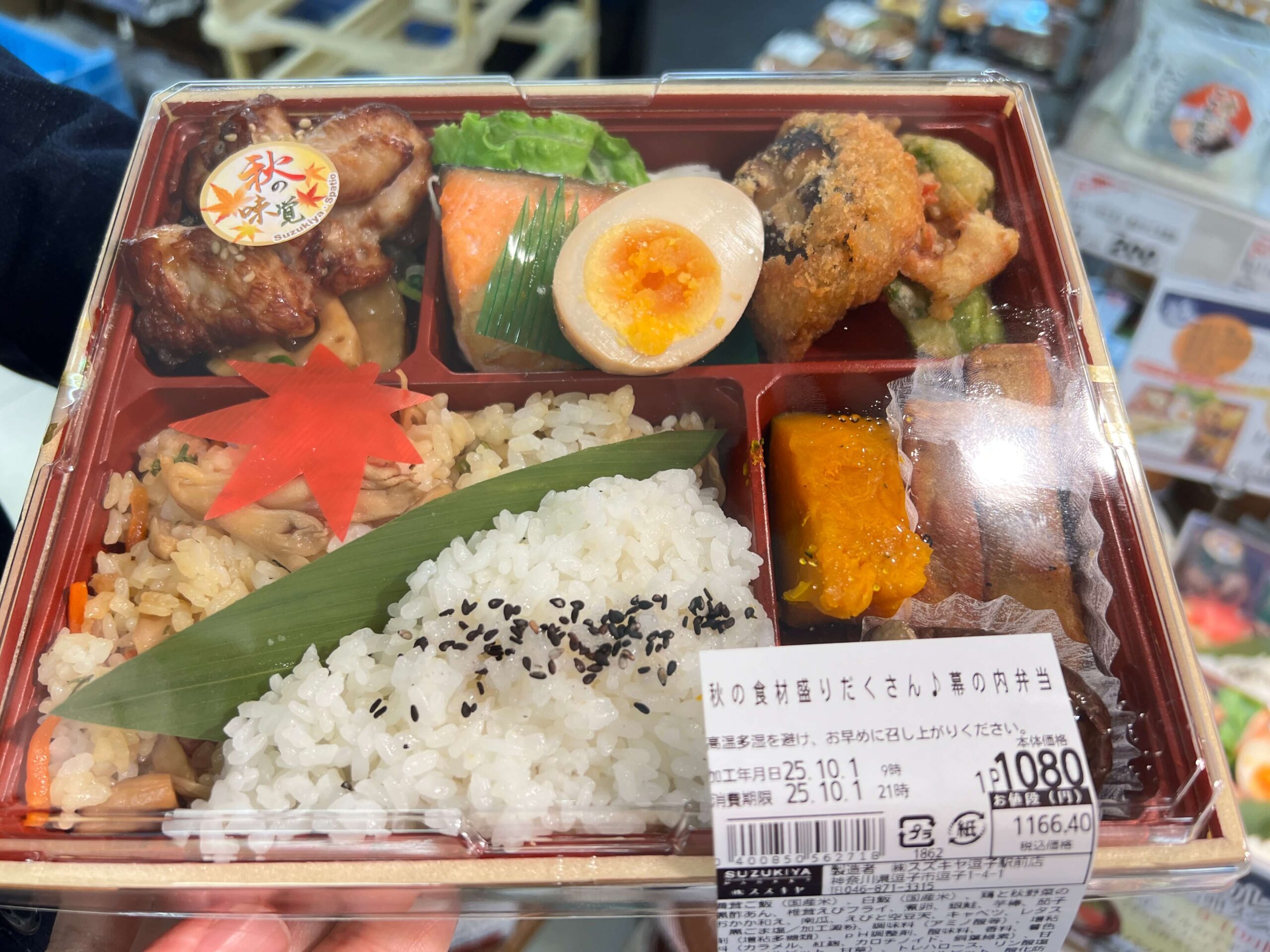 「秋の食材盛りだくさん♪幕内弁当」(税込1,080円)が取材時の久保店長の一押しお弁当でした。
