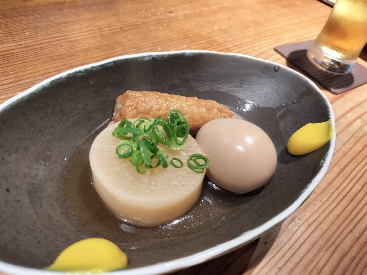 大根、たまご、ちくわという王道の三品。シンプルながら、それぞれの仕込みの丁寧さが伝わる一皿です。