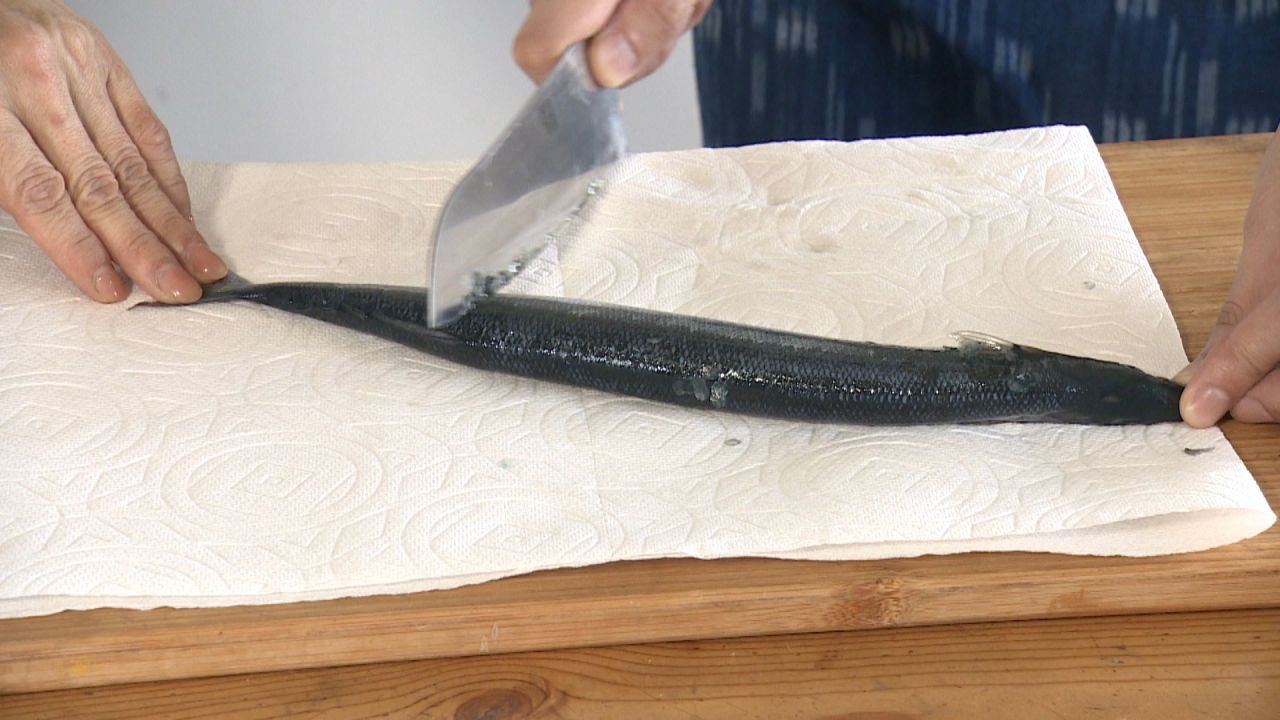 包丁の刃の方をサンマに当てて、尾びれから頭へ向かって動かします。ウロコだけでなく、汚れも取れるので、最後に身を拭いて水分を取りましょう。