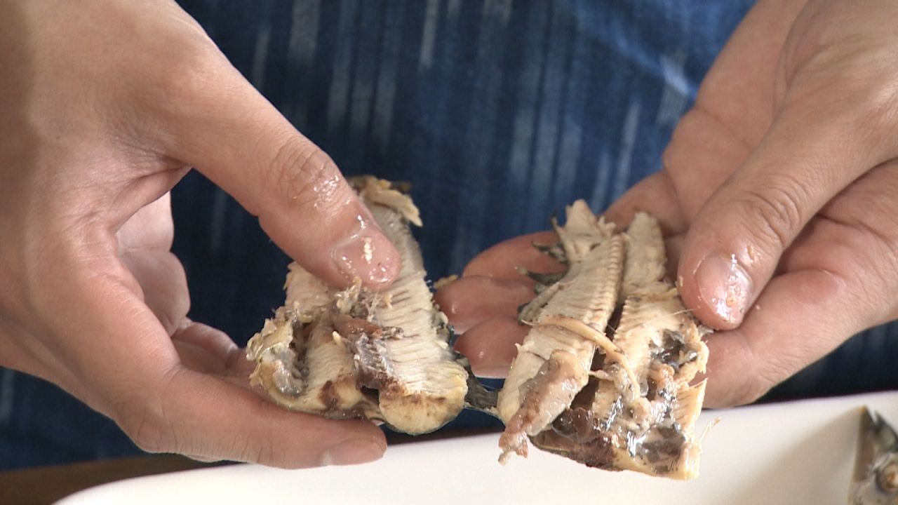 ◆POINT◆サンマは冷めてからほぐすと、身離れがよく骨が取りやすくなります。 はじめに身を半分に開いてから、骨と身の間に指を入れると簡単に大きな骨が外せます。小骨は、身を指でなぞるようにはがすと、まとめて取ることができます。