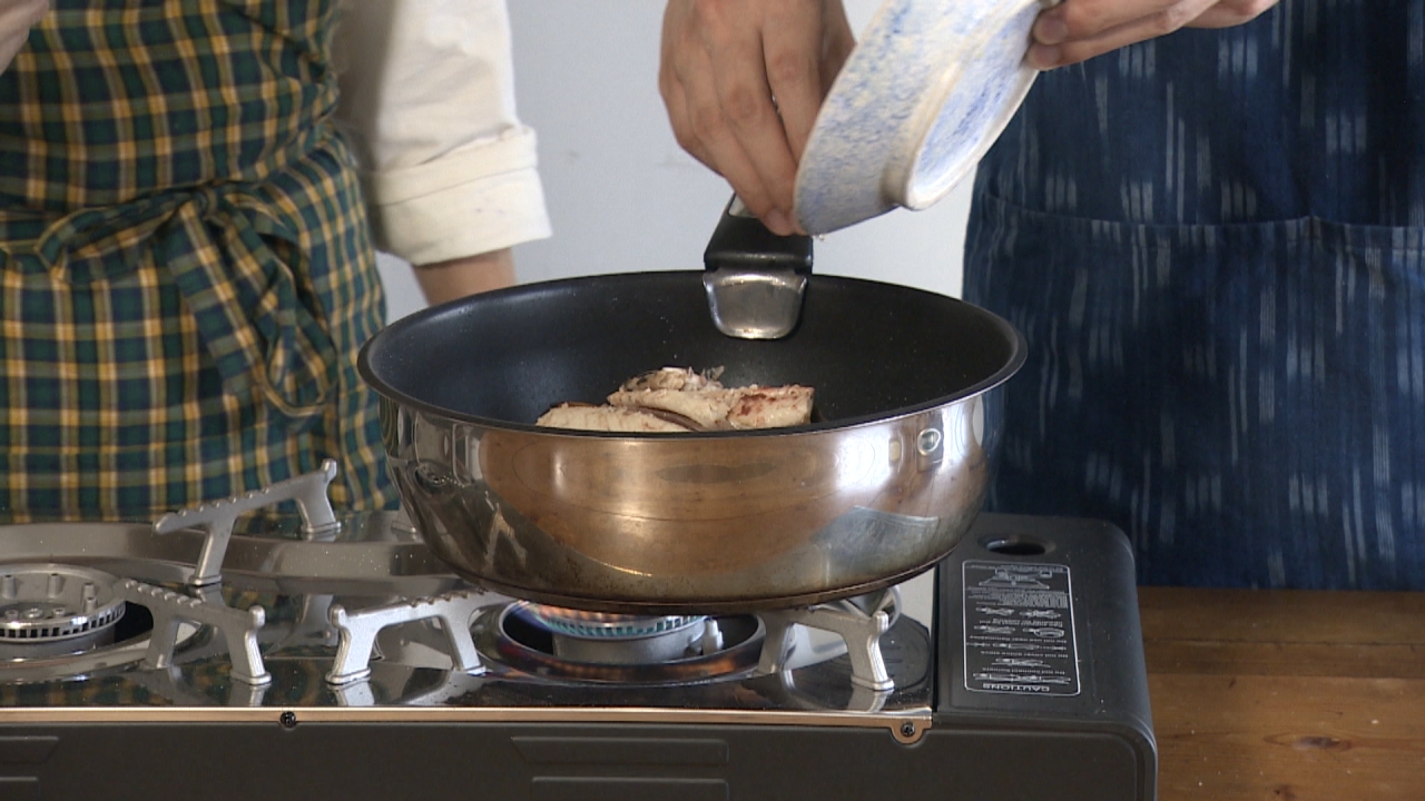 ⑤ 塩(分量外)をまぶしてフライパンで焼く