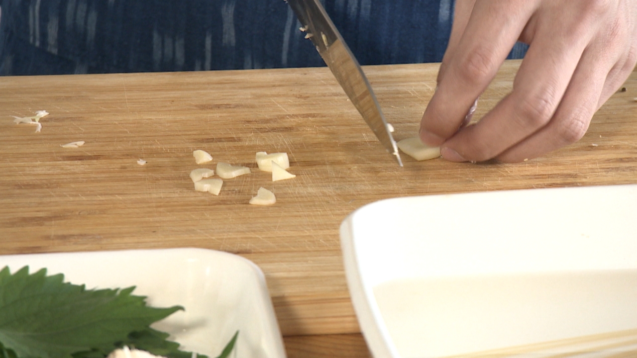 ③ ニンニクをスライスまたはみじん切りに、大葉は千切りにする。トウガラシは種をとる
